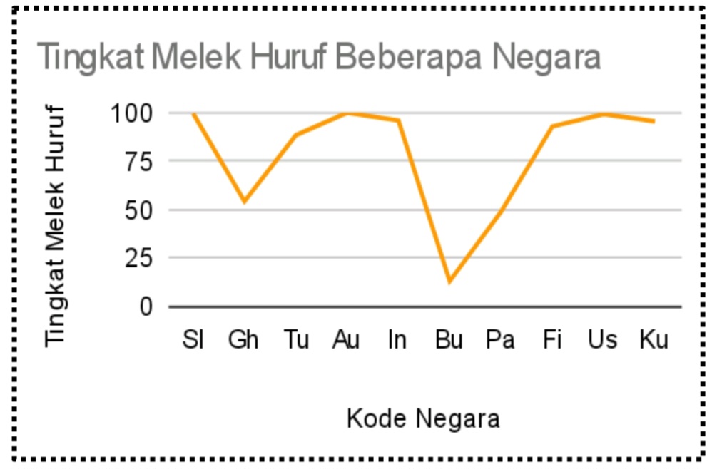 Grafik di atas adalah gambaran terhadap Tingkat Melek Huruf yang diambil sampelnya hanya dari negara tertentu saja (kode negara tidak baku) yang secara statistik belum tentu representatif, yaitu : Slovenia/Sl (99.7%), Ghana/Gh (54.1%), Turki/Tu (88.3%), Australia/Au (100%), Indonesia/In (95.9%), Burkina Faso/Bu (12.8%), Pakistan/Pa (48, 7%), Fiji/Fi (92.9%), Uzbekistan/Uz (99.3%) dan Kuba/Ku (95.5%).