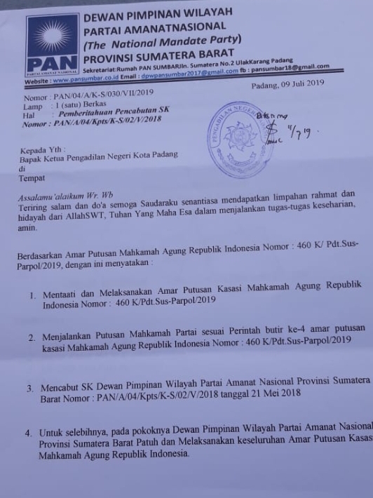 Dalam surat DPW PAN Sumbar yang ditujukan kepada Ketua Pengadilan Negeri Kota Padang itu DPW PAN menyampaikan, pertama; akan mentaati dan melaksanakan amar putusan kasasi MA No : 460K/Pdt.Sus-Parpol/2019, dimana kepengurusan sah DPD PAN Bukittinggi itu dengan ketuanya Fauzan Haviz.