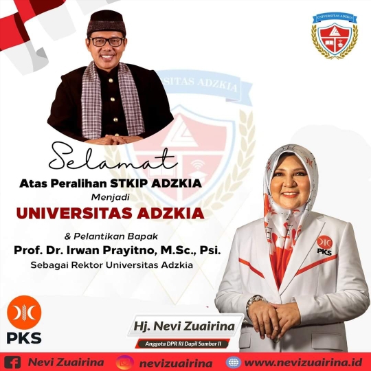 “Selamat kepada Bapak Irwan Prayitno, yang saat ini mengemban amanah menjadi Rektor Universitas Adzkia. Semoga Allah SWT memberikan keridhoannya agar segala sesuatunya dapat berjalan sesuai harapan kita semua terutama masyarakat Sumbar. Dengan dukungan seluruh pemangku kepentingan, Saya yakin, Adzkia akan bisa berkiprah banyak bagi bangsa ini bahkan untuk dunia”, tutup Nevi Zuairina