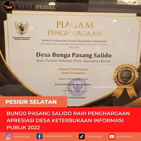 JAKARTA, forumsumbar — Nagari Bungo Pasang Salido, Kecamatan IV Jurai, Kabupaten Pesisir Selatan (Pessel) yang mewakili Provinsi Sumbar, berhasil meraih penghargaan dalam ajang Apresiasi Desa Keterbukaan Informasi Publik Tahun 2022 yang digelar Komisi Informasi (KI) Pusat.