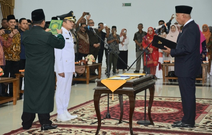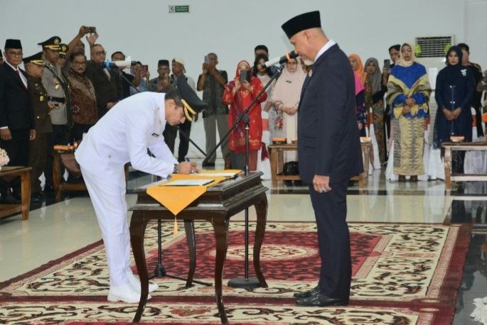 Dilanjutkan dengan pengucapan sumpah jabatan yang dipandu oleh Gubernur Sumbar Mahyeldi, dan penandatanganan berita acara pelantikan serta pemasangan tanda jabatan.