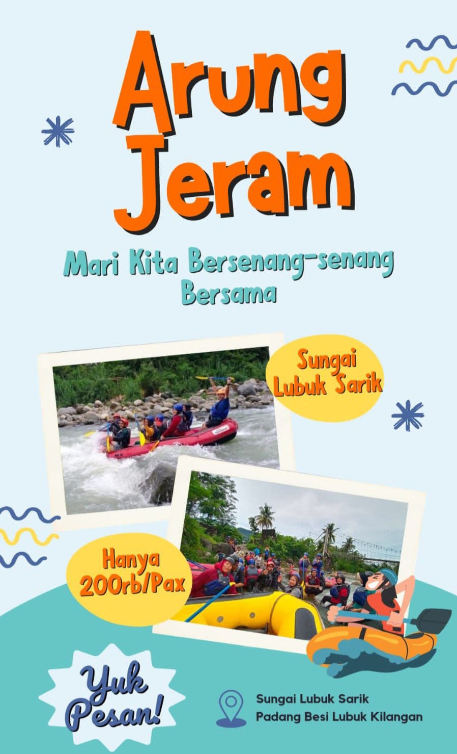 Jadi apalagi, bagi yang berminat untuk arung jeram di Sungai Lubuk Sarik silahkan hubungi; Rio Handevis +62 819 7577 788.