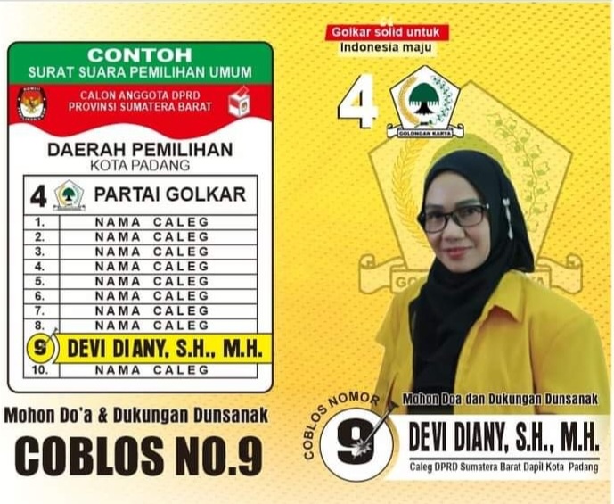 “Untuk mengkonkretkan tujuan itu, saya mohon doa dan dukungannya kepada masyarakat Kota Padang, agar pada tanggal 14 Februari 2024 itu, pada saat Pemilu berlangsung, memilih Caleg DPRD Sumbar-nya Devy Diany, SH, MH dari Partai Golkar dengan nomor urut 9,” tukasnya.
