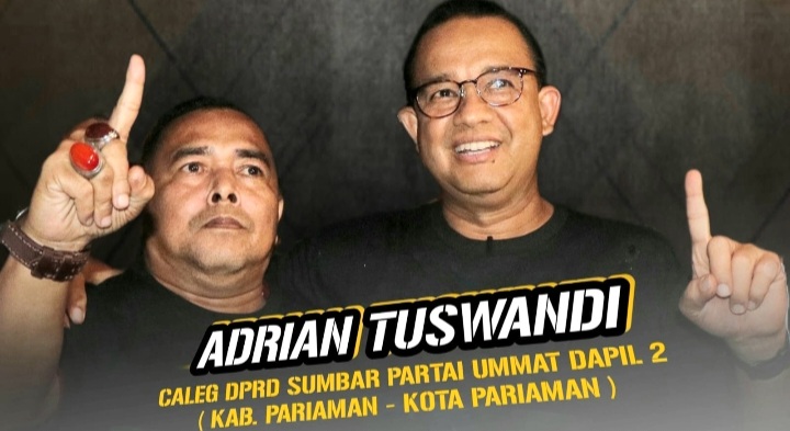 Caleg DPRD Sumbar Daerah Pemilihan (Dapil) Sumbar 2 (Padang Pariaman- Pariaman) dari Partai Ummat nomor urut 1 Adrian Tuswandi bersama Capres Anies Baswedan. (Foto : adr)
