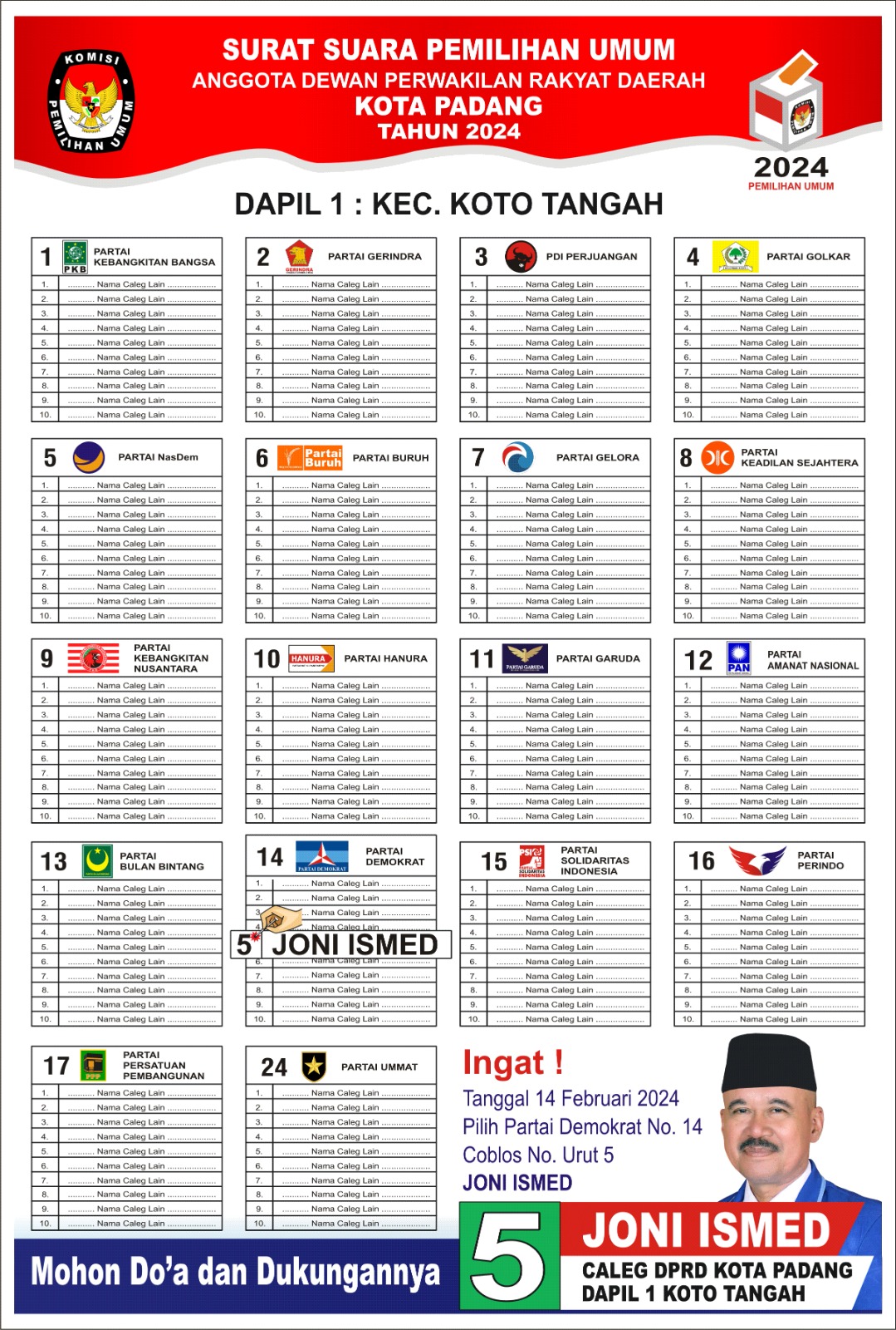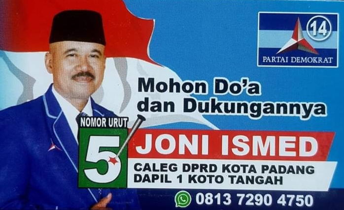 “Mohon dukungan kapado dunsanak sadonyo, berkenan mamiliah Ambo, Joni Ismed, untuk DPRD Padang Dapil Padang 1 untuak Kecamatan Koto Tangah dari Partai Demokrat dengan nomor urut 5. Atas kemurahan hati dunsanak, kawan-kawan, apak, etek, uni, uda, adiak-adiak, kamanakan, sadonyo, Ambo ucapkan tarimo kasih,” ujar Joni Ismed, Rabu (31/1/2024).