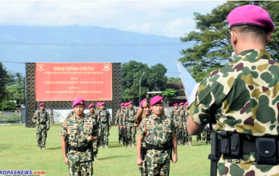 Serah terima jabatan dari Letkol Mar Qomaru Zaman, MTr.Opsla kepada Mayor Mar Ricky Sandro, MTr.Opsla dilaksanakan di lapangan upacara Mako Kolatmar Jl Embong Miring No 01 Sumberanyar Nguling Pasuruan, Jawa Timur, Jumat (26/4/2024).