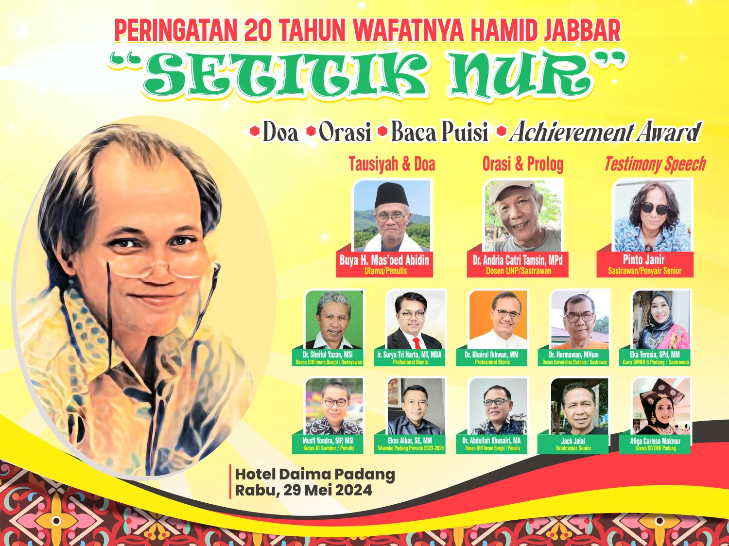 “Kami dari pelaksana acara mengundang masyarakat Sumbar, khususnya pecinta seni untuk ikut hadir di acara ‘Peringatan 20 Tahun Wafatnya Hamid Jabbar’ ini,” tukuk Isa.