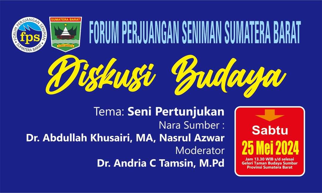 Memang, rencananya FPS Sumbar akan menggelar Diskusi Budaya, dengan narasumber Dr Abdullah Khusairi, MA dan Nasrul Azwar, serta dimoderatori oleh Dr Andria C Tamsin, MPd, pada hari Sabtu 25 Mei 2024, pukul 13.30-17.00, di Galeri Taman Budaya Sumbar Jl Diponegoro Padang.