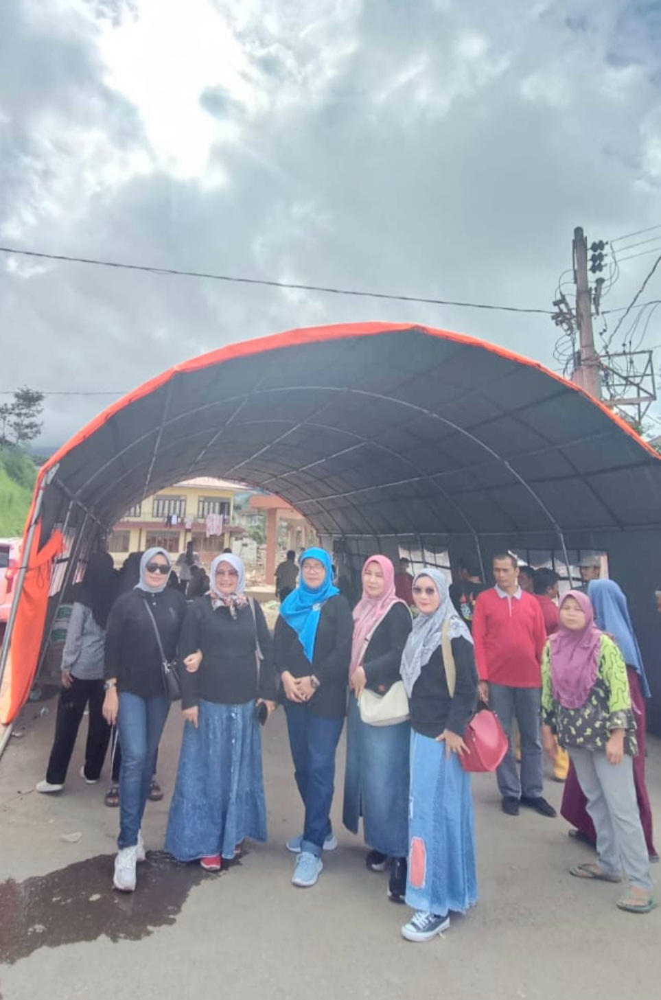 Tim alumni berfoto di tenda pengungsian di Jorong Pagu-Pagu Nagari Pandai Sikek. (Foto : Indah)