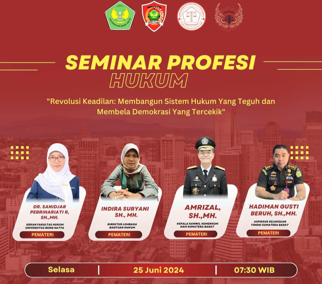 PADANG, forumsumbar —Fakultas Hukum Universitas Bung Hatta menggelar Seminar Profesi Hukum dengan tema; “Revolusi Keadilan: Membangun Sistem Hukum yang Teguh dan Membela Demokrasi yang Tercekik“, bertempat di Kampus II Universitas Bung Hatta, Aia Pacah Padang, Selasa (25/6/2024).