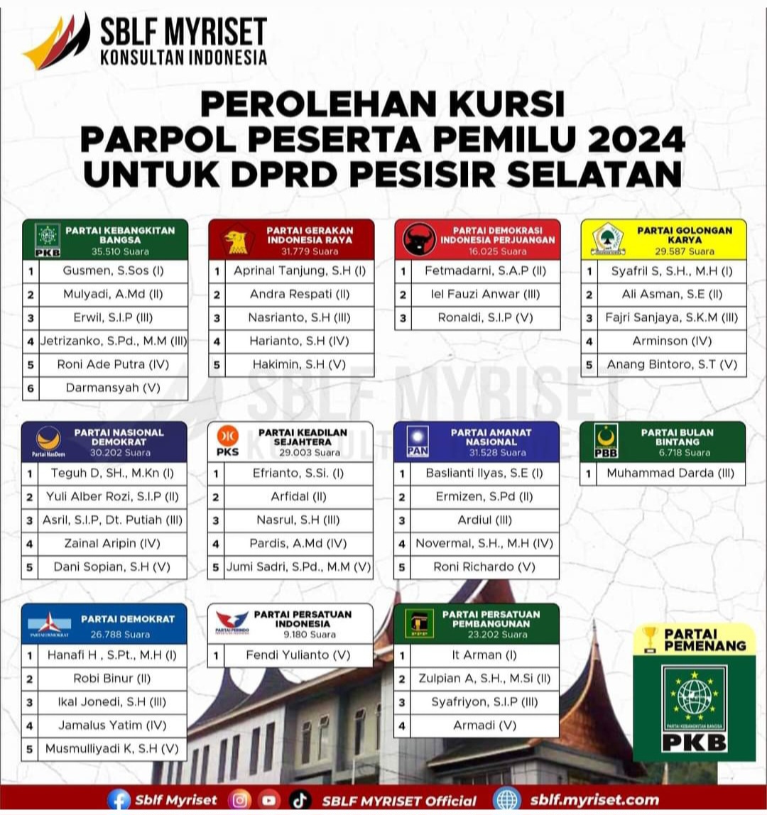 Adapun dari total 45 kursi DPRD Pessel, pada Pemilu 2024 lalu, PKB berhasil meraih 6 kursi, dan akan mengisi Ketua DPRD Pessel. Kemudian, Gerindra 5 kursi, NasDem 5, Demokrat 5, PKS 5, PAN 5, Golkar 5, PPP 4, PDIP 3, PBB 1 dan Perindo 1.