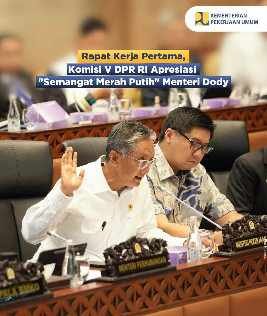 JAKARTA, forumsumbar —Menteri PU (Pekerjaan Umum) Dody Hanggodo didampingi para Pejabat Tinggi Madya dan Pratama di lingkungan Kementerian PU menghadiri Rapat Kerja Komisi V DPR RI mengenai Perkenalan dan Penjelasan Tugas Pokok dan Fungsi Kementerian PU.