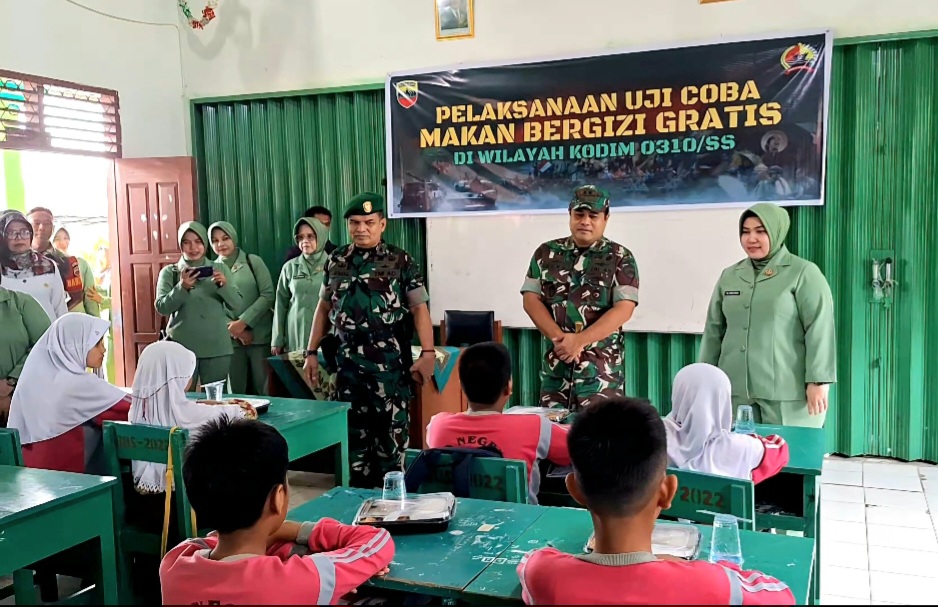 Dandim 0310/SS Letkol Inf Reno Handoko, SE didampingi Ketua Persit KCK Cabang LXIV Dim 0310 Ny. Dora Reno Handoko ikut membagikan uji coba makanan bergizi gratis ini di SD Negeri 20 Muaro sebanyak 200 Porsi yang memenuhi kecukupan gizi tumbuh kembang anak.