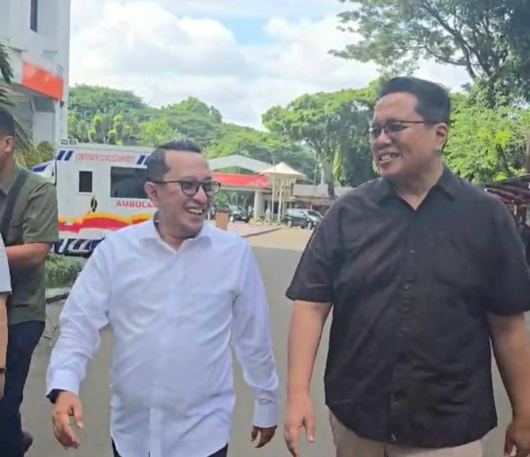 Berkemeja putih Bupati terpilih Eka Putra dan Wakil Bupati terpilih Ahmad Fadly berkemeja kotak-kotak hitam memasuki Gedung Kemendagri, dimana pada hari ini ada tiga sesi pemeriksaan kesehatan.
