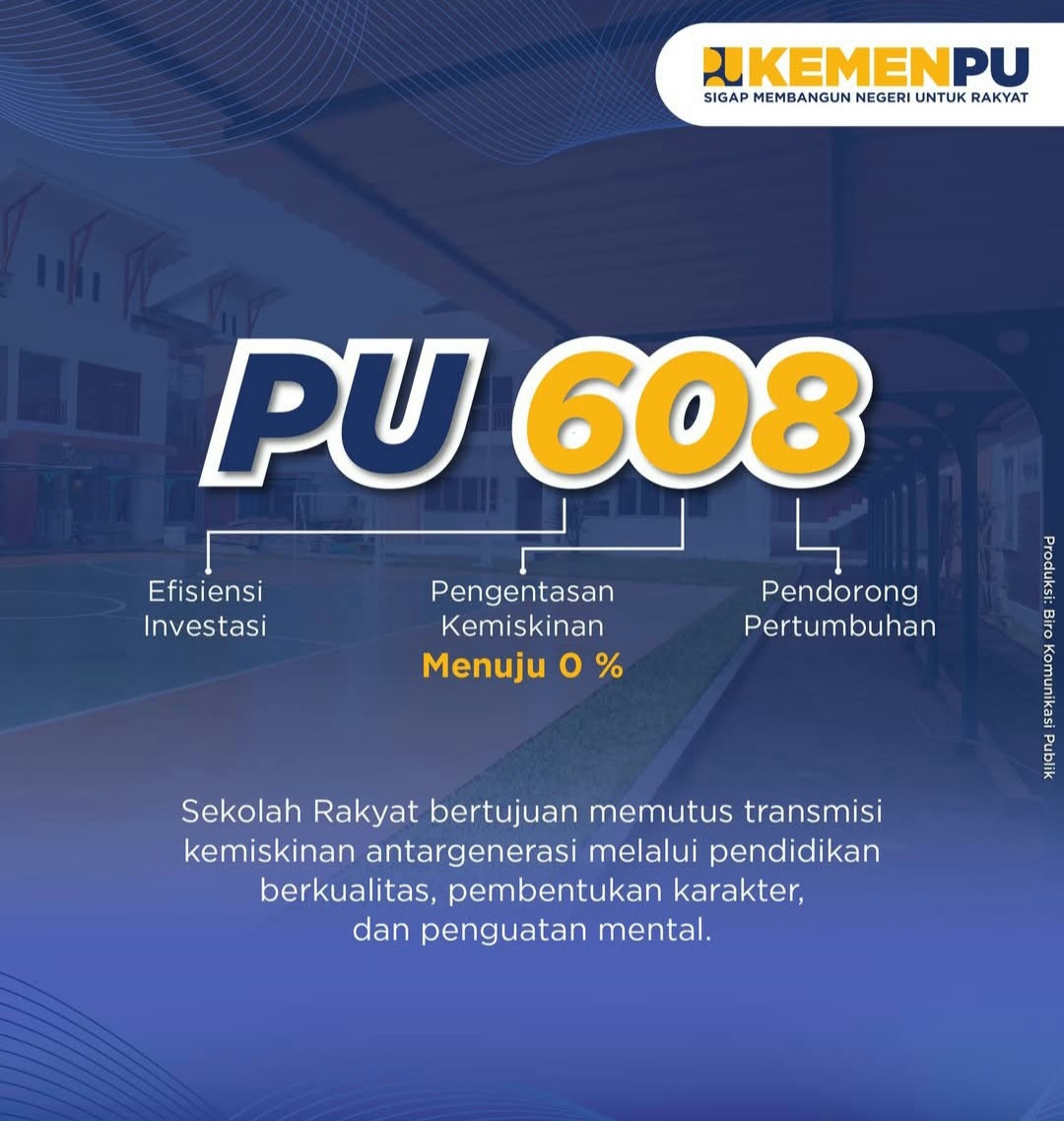 Sebagai bagian dari PU 608, salah satunya dalam misi Pengentasan Kemiskinan menuju 0%, Menteri PU Dody Hanggodo berkomitmen mendukung penyediaan infrastruktur pendidikan yang berkualitas melalui Sekolah Rakyat.