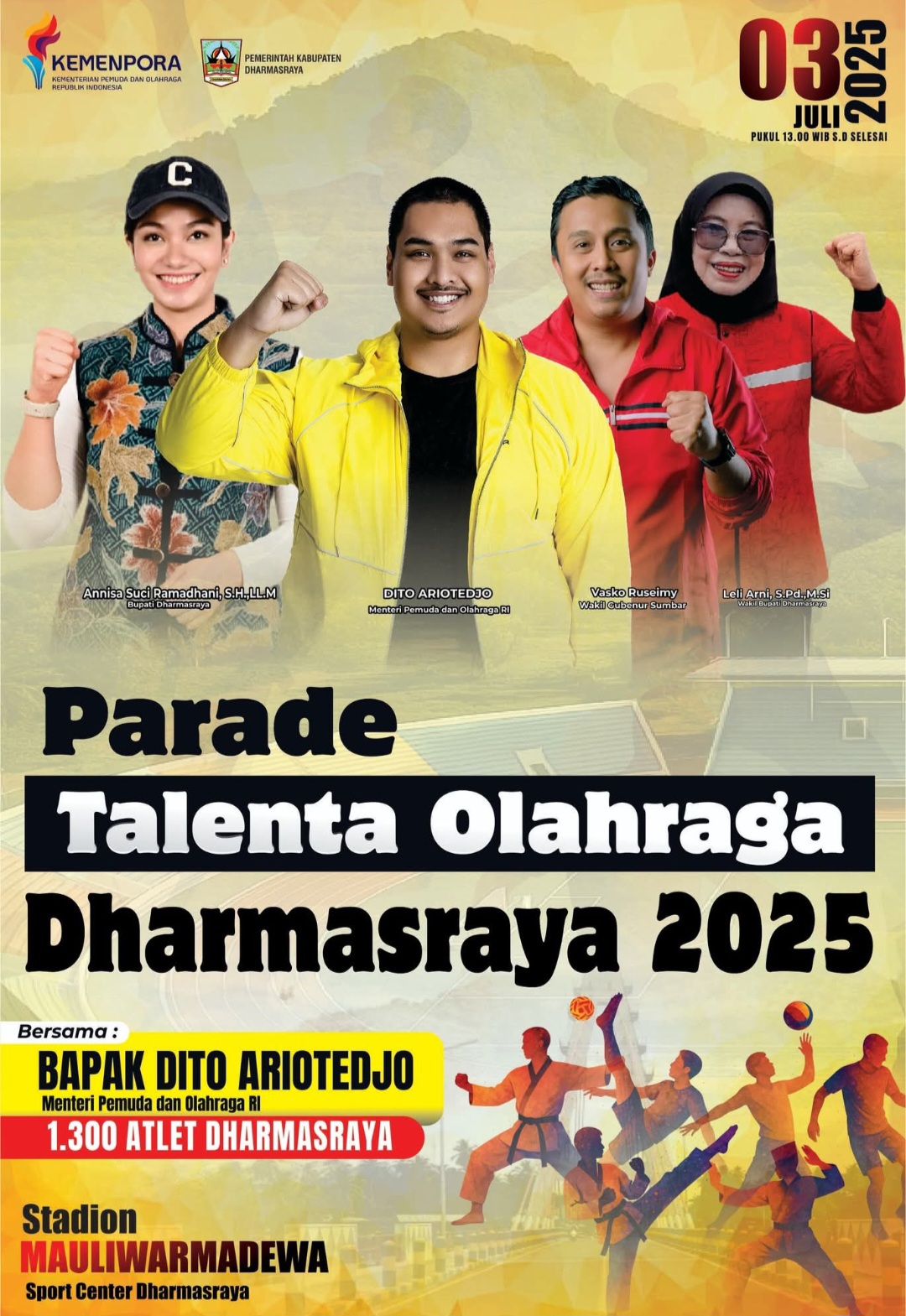 DHARMASRAYA, forumsumbar –— Kegiatan “Parade Talenta Atlet Dharmasraya” yang semula direncanakan pada Senin, 30 Juni 2025, dijadwal ulang, dan jadinya dilaksanakan pada Kamis, 3 Juli 2025, di GOR Mauliwarmadewa Sport Center, Pulau Punjung, Dharmasraya.
