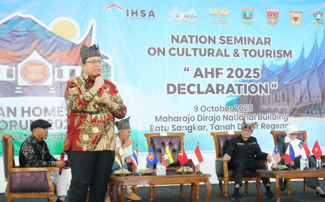 TANAH DATAR, forumsumbar-— Wakil Bupati Tanah Datar Ahmad Fadly sambut baik dan berikan apresiasi atas pelaksanaan Nation Seminar On Cultural and Tourism “Asean Homestay Forum (AHF) 2025 Declaration”, di Tanah Datar yang dilaksanakan di Gedung Maharajo Dirajo Batusangkar, Kamis (9/10/2025).