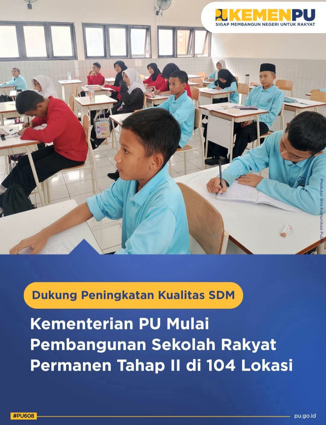JAKARTA, forumsumbar –— Kementerian Pekerjaan Umum (PU) melanjutkan komitmennya dalam mendukung peningkatan kualitas sumber daya manusia melalui pembangunan Sekolah Rakyat (SR) Tahap II di 104 lokasi seluruh Indonesia, setelah sebelumnya menyelesaikan 165 Sekolah Rakyat Rintisan Tahap I.