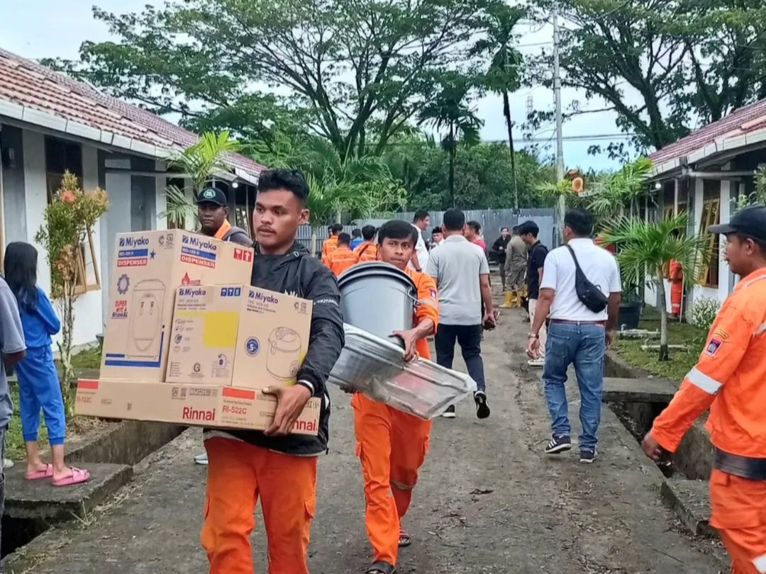 Di antara sisa lumpur dan puing yang masih berserakan, petugas Satpol PP tampak hilir-mudik menyisir gang dan sudut-sudut permukiman. Mereka membantu mengangkat barang warga—mulai dari pakaian, peralatan dapur, hingga kasur basah—lalu menuntun anak-anak dan lansia menuju armada yang telah standby.