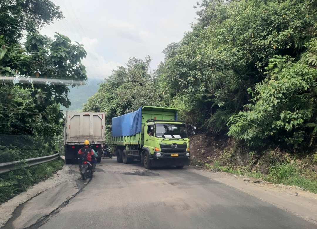 Truk dengan muatan melebihi kapasitas jalan provinsi itu juga sudah lama merusak jalan di tanjakan Sungai Pisang.