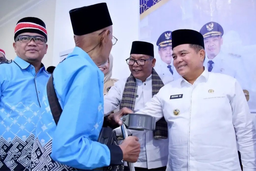 Bupati Agam Benni Warlis saat melakukan pelepasan CJH, di Surau Ka’bah Inyiak Tuah Panampuang, Jumat (24/4/2026), mengaku bersyukur atas keberangkatan jemaah yang telah lama mereka nantikan.